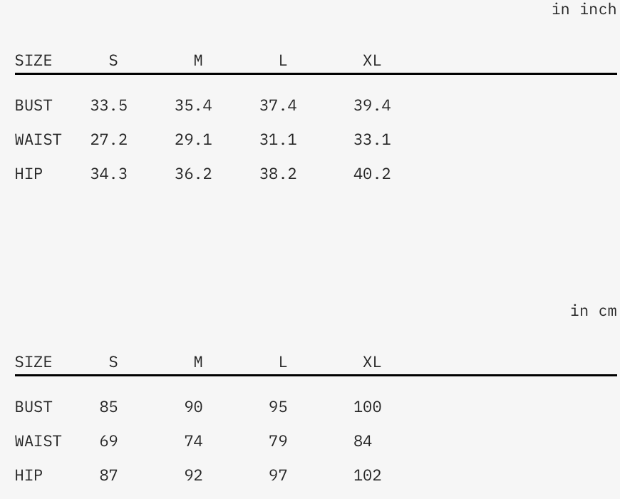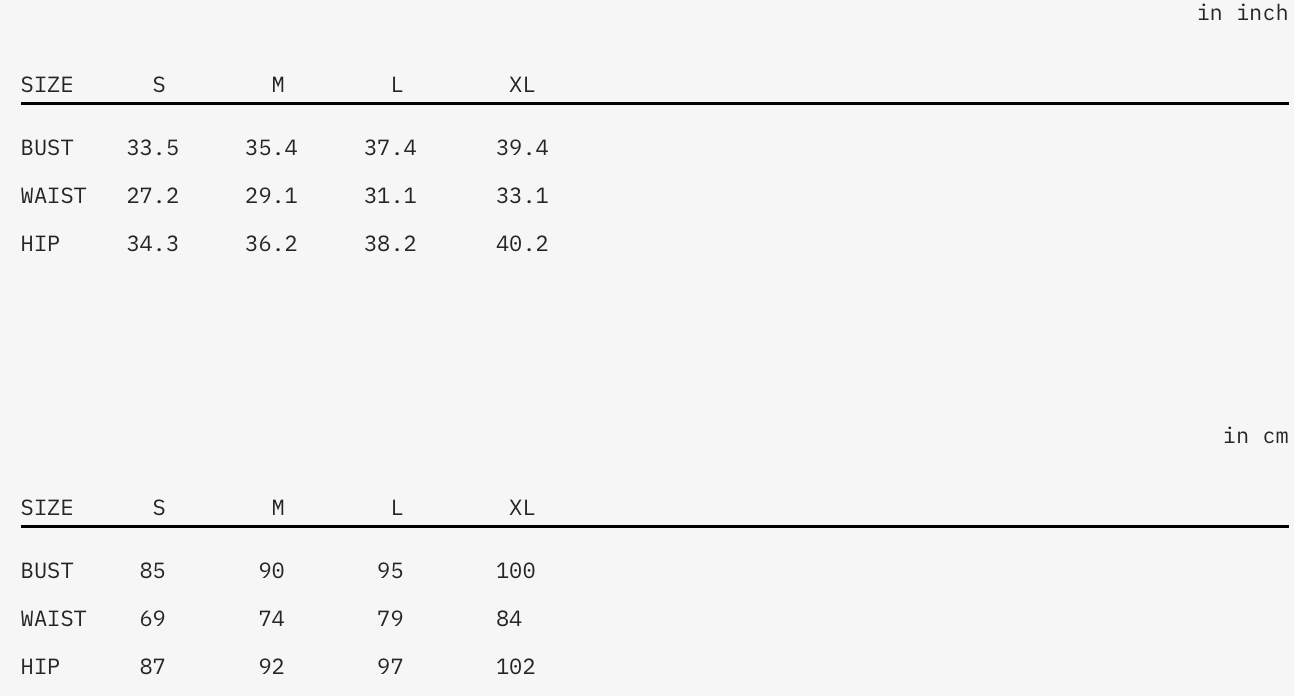 If you’re between sizes, we recommend sizing up for a more relaxed fit or down for a tighter, second-skin silhouette.